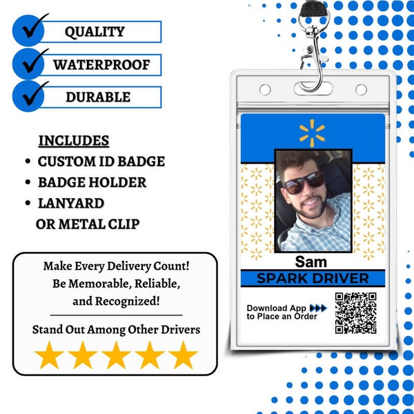 Enhance your professionalism with this custom Spark ID badge. Designed for durability, it’s waterproof and built to last through daily deliveries. The badge includes your name and photo. A QR code directs to the app for potential customers you may encounter who have an interest in ordering. Complete with a secure badge holder and choice of lanyard or metal clip, it’s the perfect accessory to stand out and build trust with every delivery. Great for new or seasoned Spark delivery drivers. Make it easy for employees to notice and recognize you when picking up an order. Spark swag gear. Spark accessories.