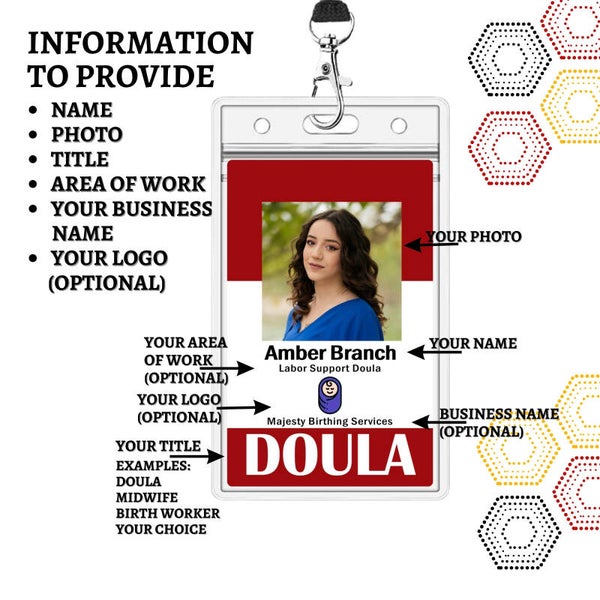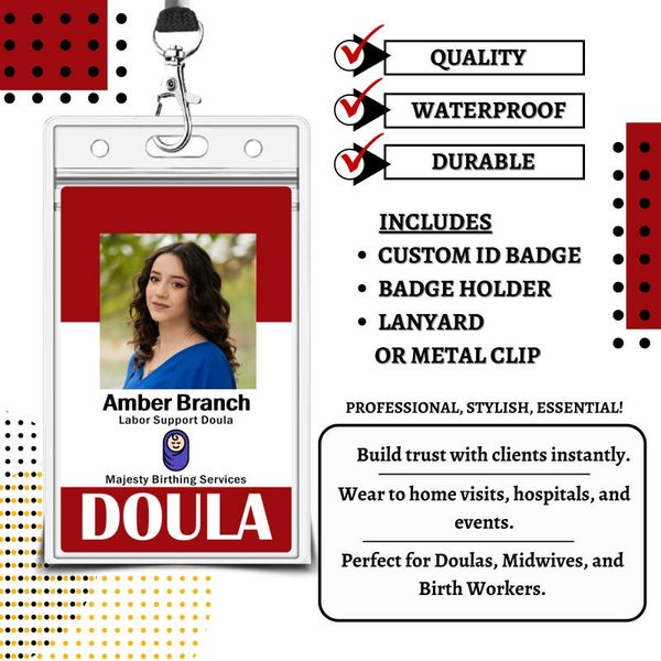 Enhance your professional image with a Custom Doula ID Badge designed with durability, clarity, and style. This high-quality badge features your name, title, and business branding, ensuring clients recognize you as a trusted birth support professional. Each badge comes with a waterproof and durable holder, plus your choice of a lanyard or metal clip for easy wear. Whether attending births, consultations, or workshops, this ID badge adds credibility and professionalism to every client interaction.
