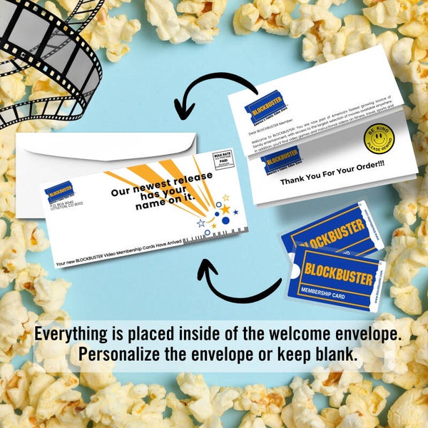 - 🎬 Complete Nostalgia Pack: Includes 2 novelty Blockbuster Membership Cards, Welcome Letter, “Free Rental” coupon & themed envelope with address label.